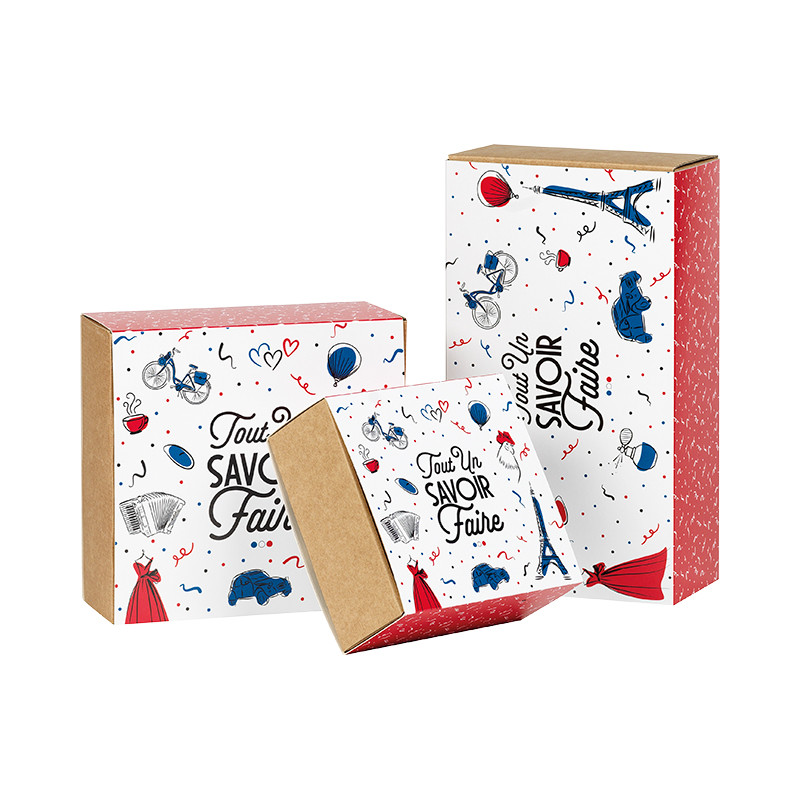 Caja cartón kraft cuadrada funda TODO UN SABER HACER azul/blanco/rojo entrega plana dimensiones interiores