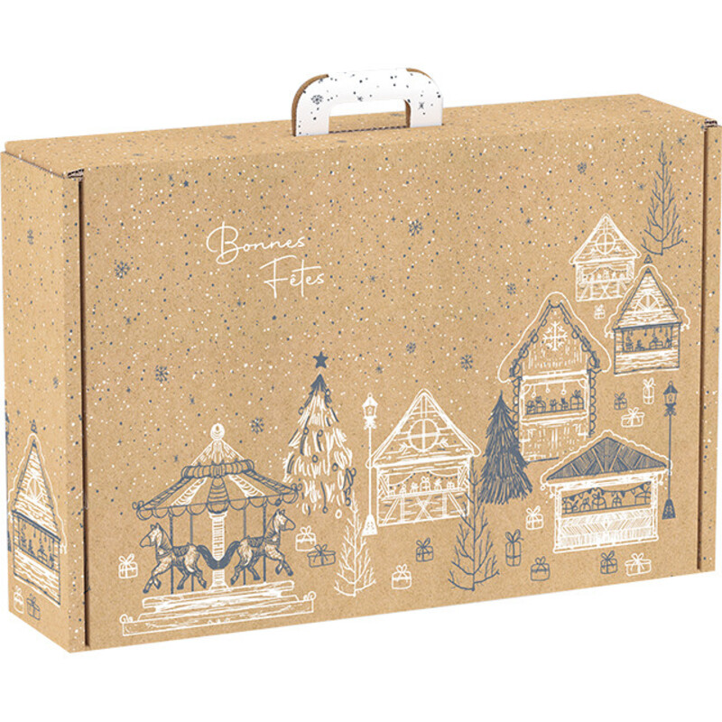 Notre valisette rectangle en carton kraft chalets "bonnes fêtes" est disponible en plusieurs tailles différentes selon vos besoins.