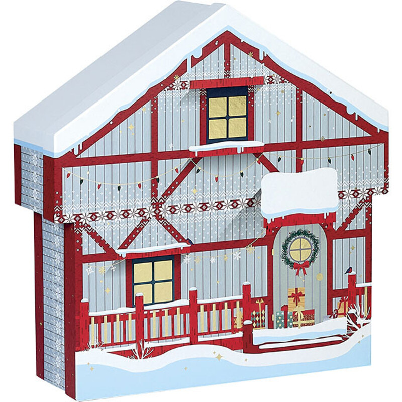 Notre coffret carton forme chalet décor "Bonnes Fêtes" est idéal pour vos compositions de produits et emballages cadeaux de fin d'année.