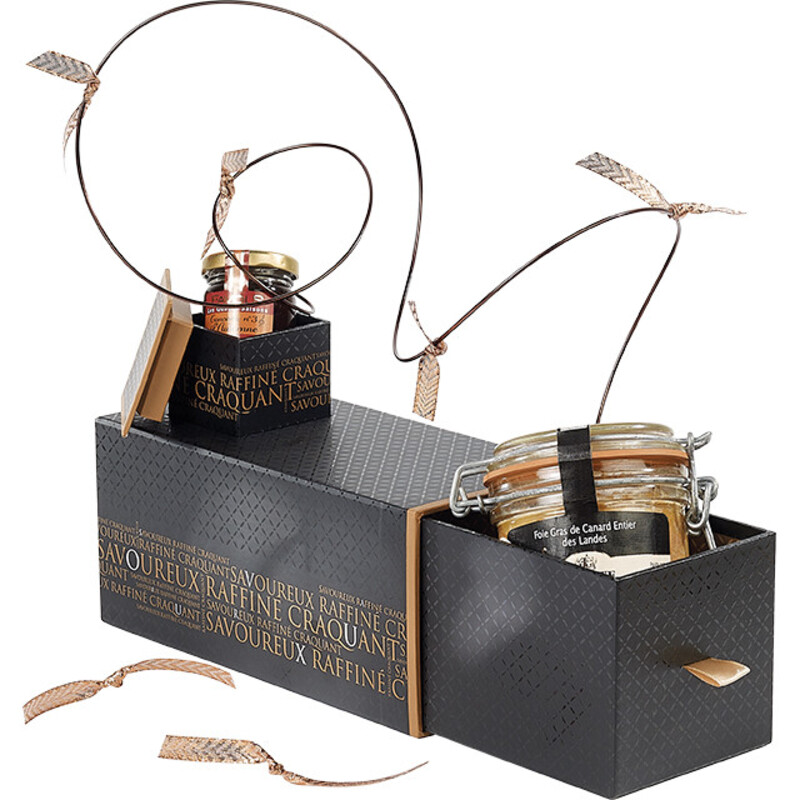 Notre équipe de designers est disponible pour personnaliser vos emballages à l’image de votre entreprise.Coffret carton rectangle 2 compartiments tirette SAVOUREUX noir/cuivre/vernis sélectif-Les Bonnes Affaires 2026