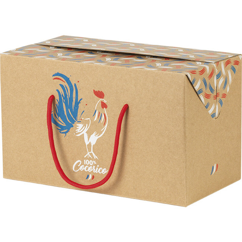 Notre équipe de designers est disponible pour personnaliser vos emballages à l’image de votre entreprise.Coffret carton kraft rectangle 100% COCORICO cordelettes rouges fermetures latérales-Les Bonnes Affaires 2026