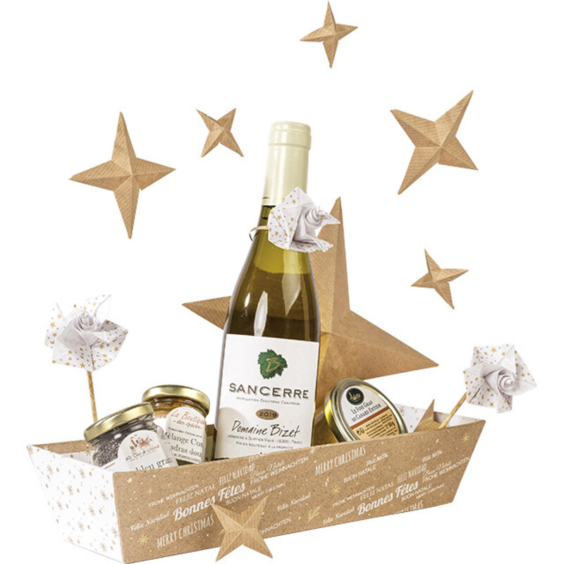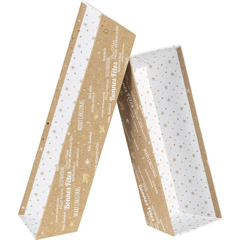 Notre équipe de designers est disponible pour personnaliser vos emballages à l’image de votre entreprise.Corbeille carton rectangle BONNES FÊTES kraft/blanc/dorure à chaud or-Les Bonnes Affaires 2026
